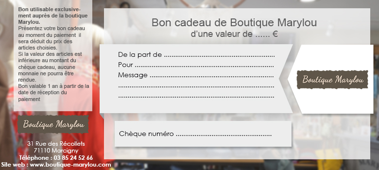 Marylou, votre boutique de prêt-à-porter féminin et masculin à met à votre disposition à Marcigny (71 – Saône-et-Loire) ses chèques cadeaux.